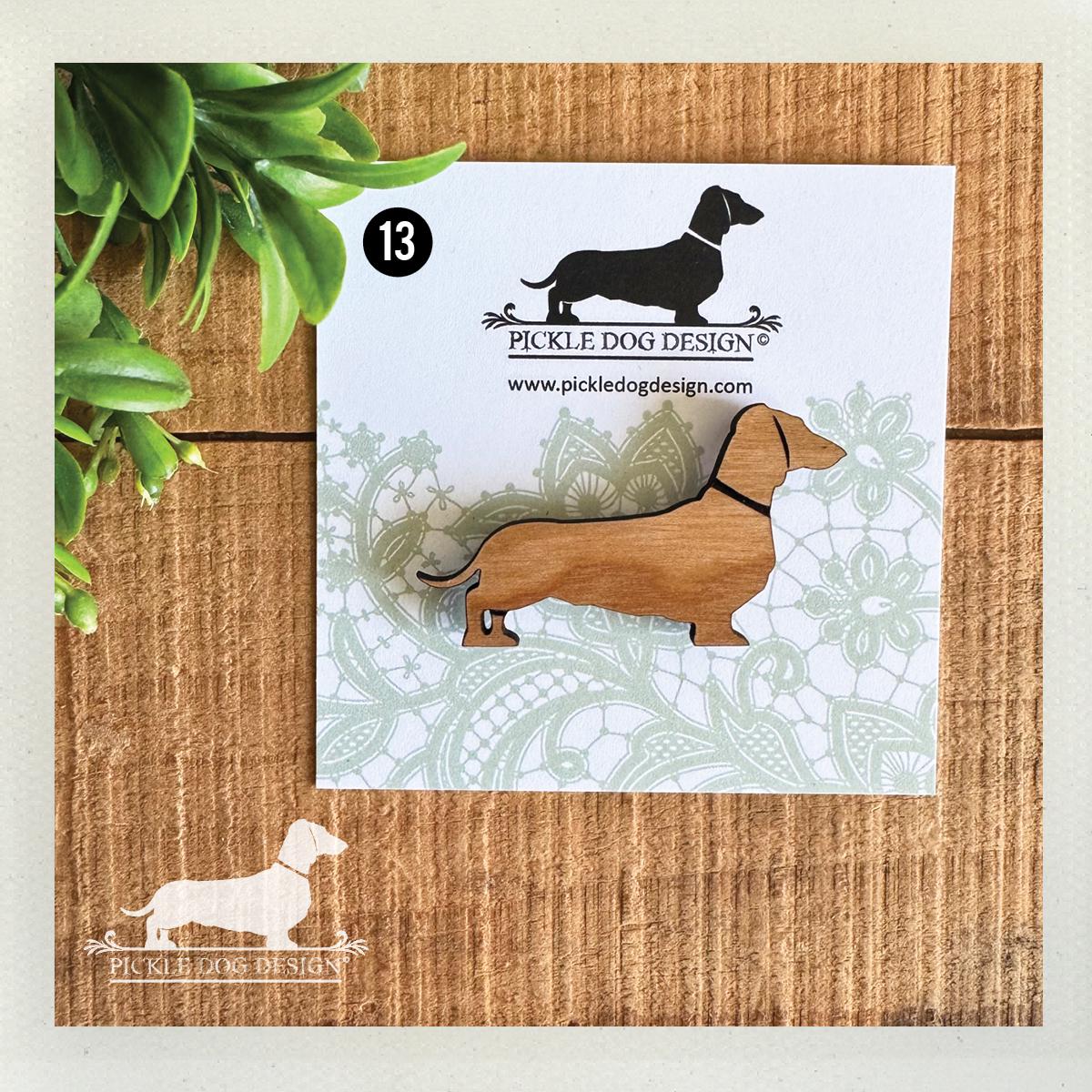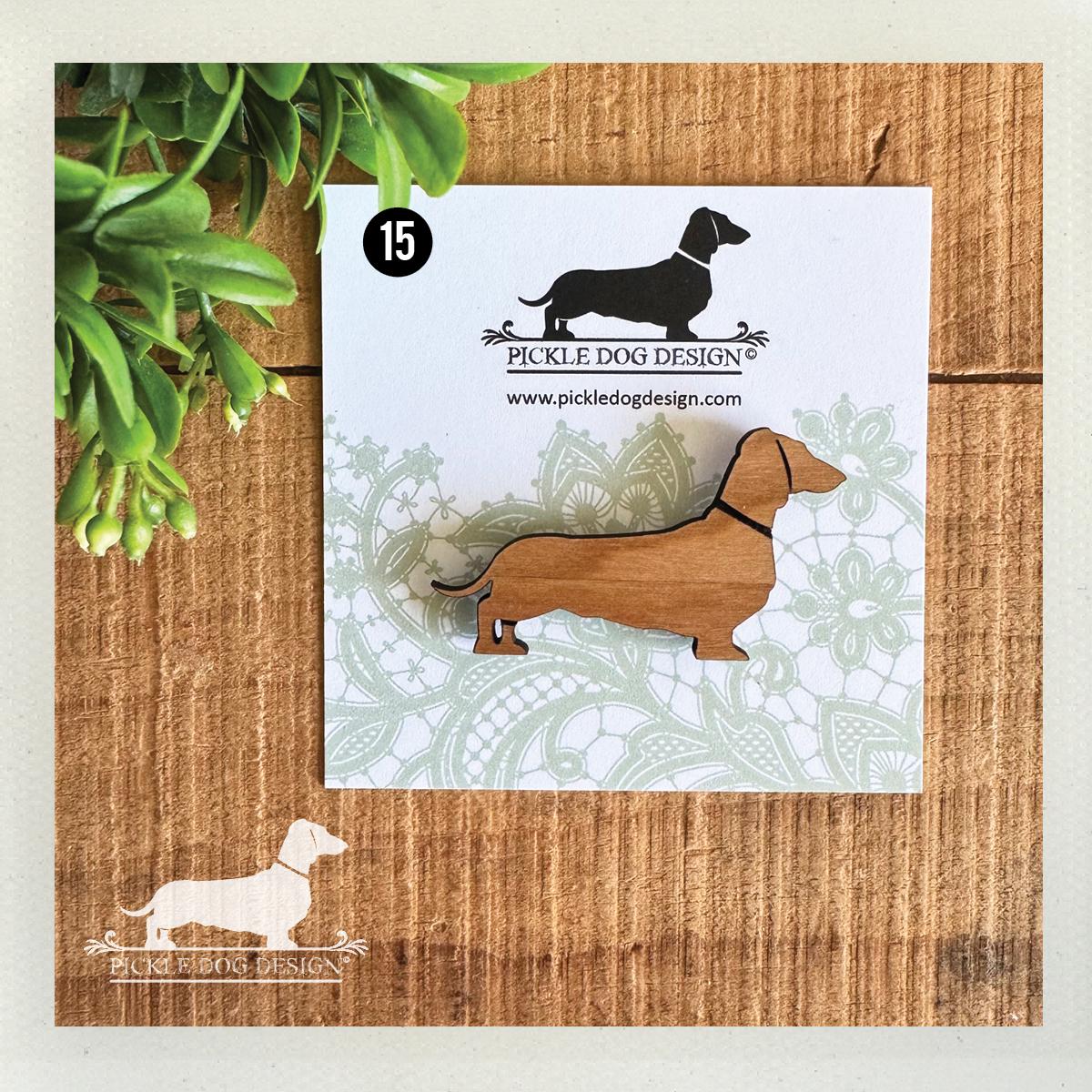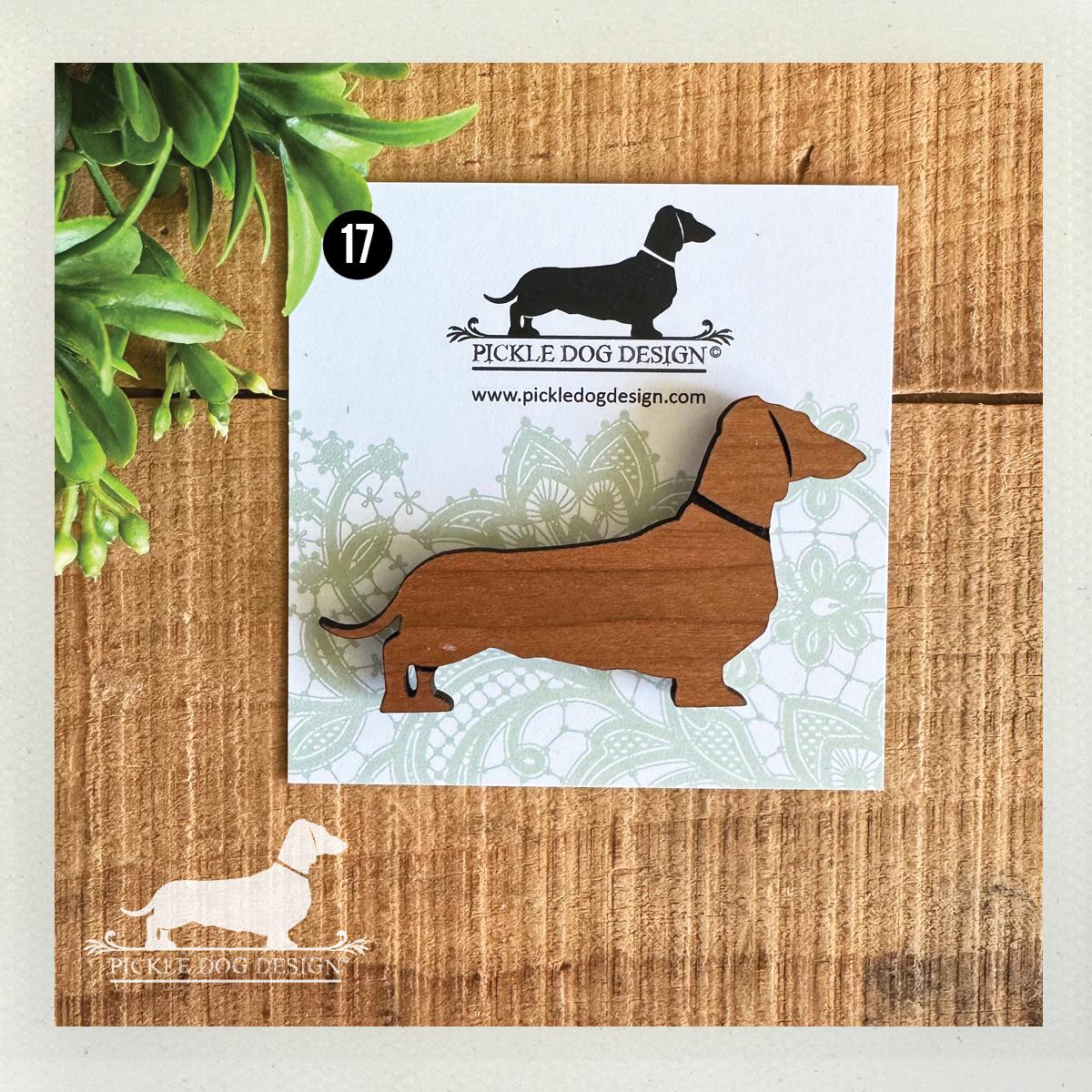 Smooth doxie magnets are made from maple, cherry, and walnut wood.