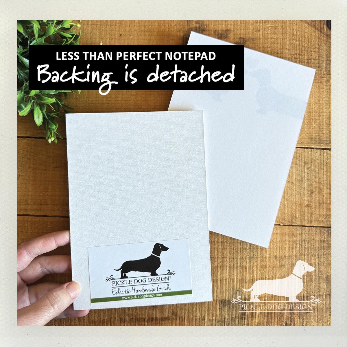 If you don't mind a slight imperfection, then you found a deal! This notepad's cardboard backing is detached... and instead of tossing it, we're hoping that at a discounted price it will find a loving home!