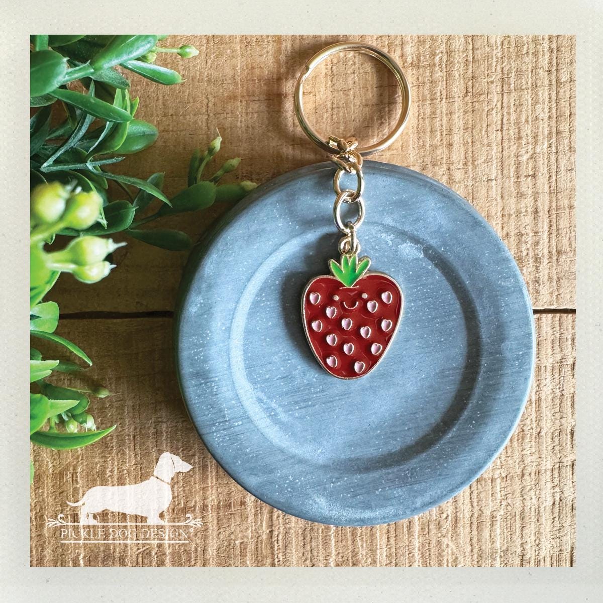 Strawberry pendant measures about 0.75" x 1" (19mm x 25mm).