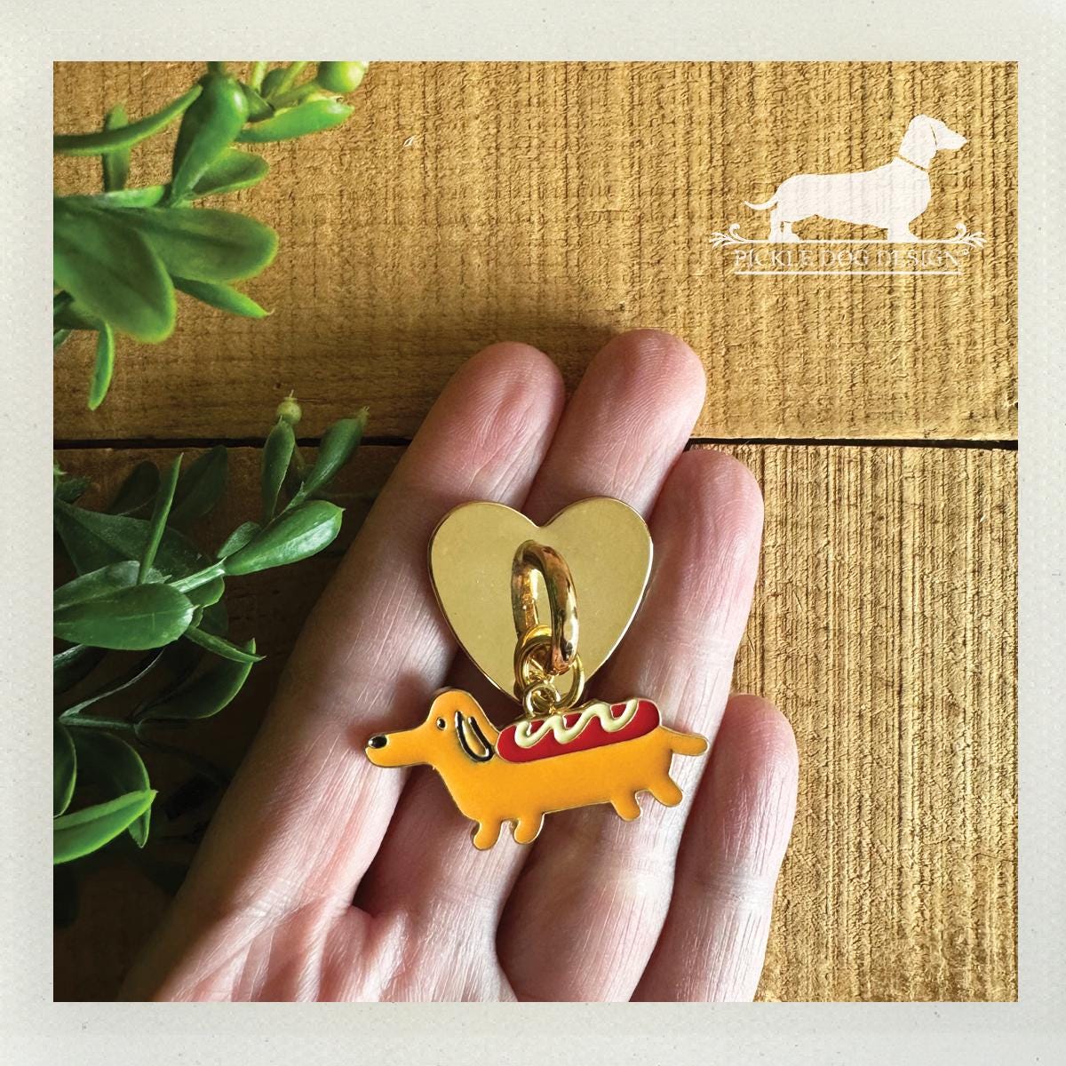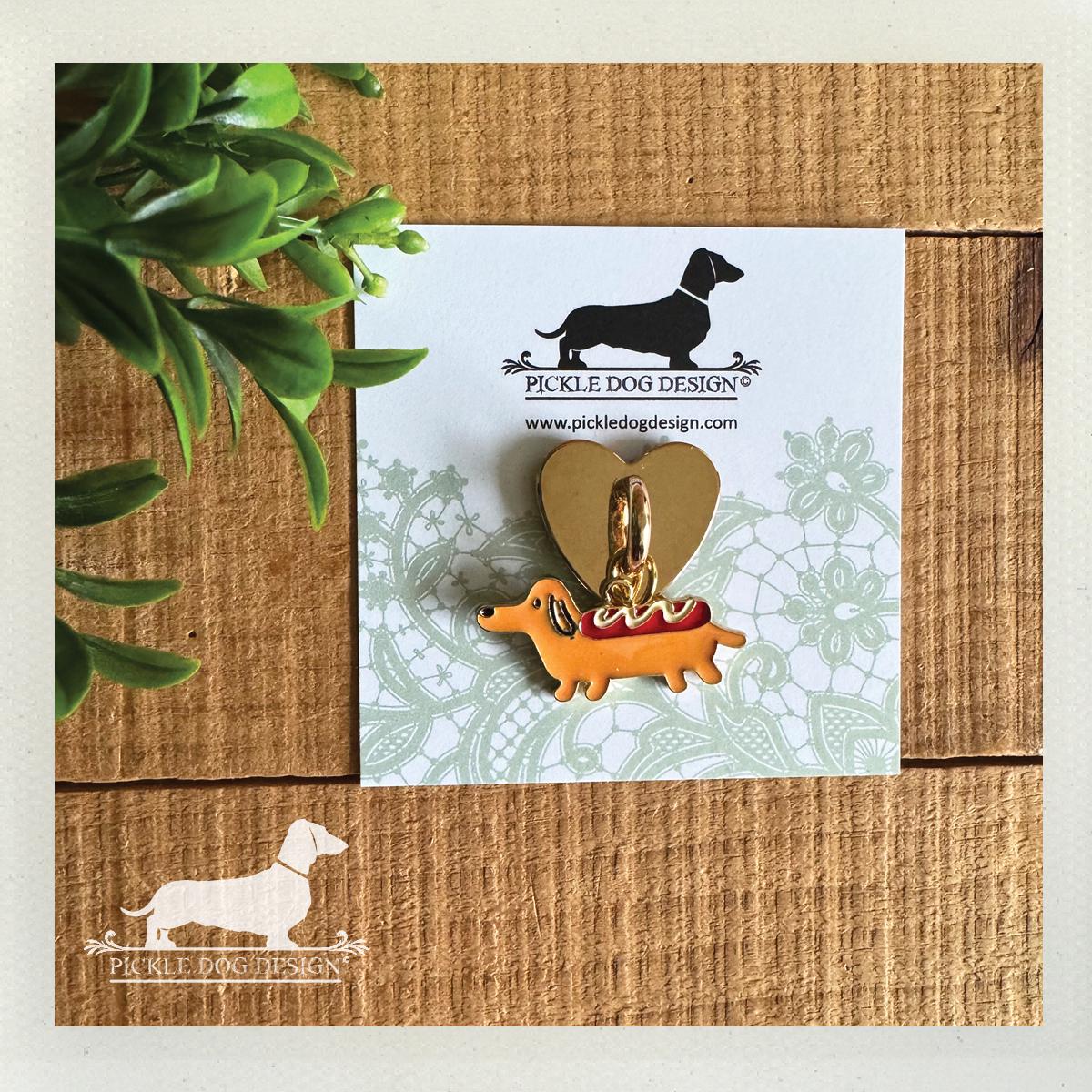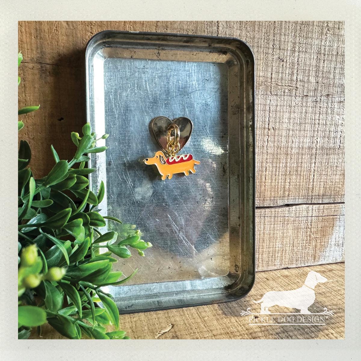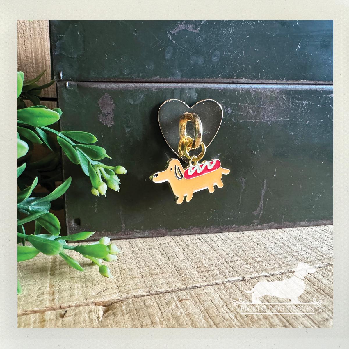 Hot dog doxie charm measures about 1.5" x 0.75" (38mm x 19mm).