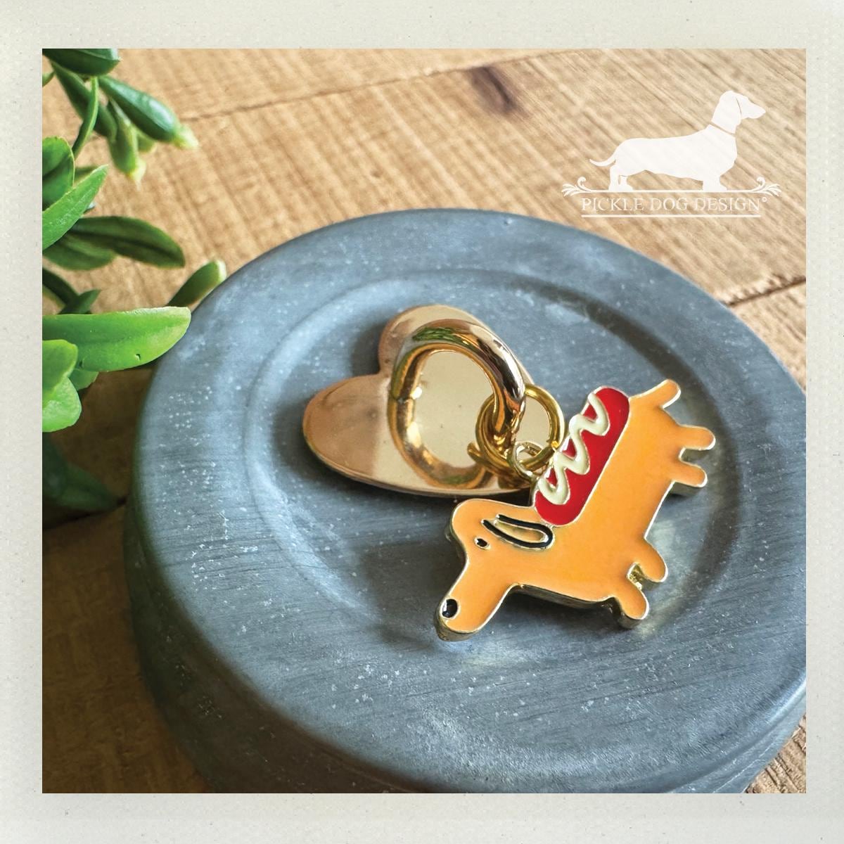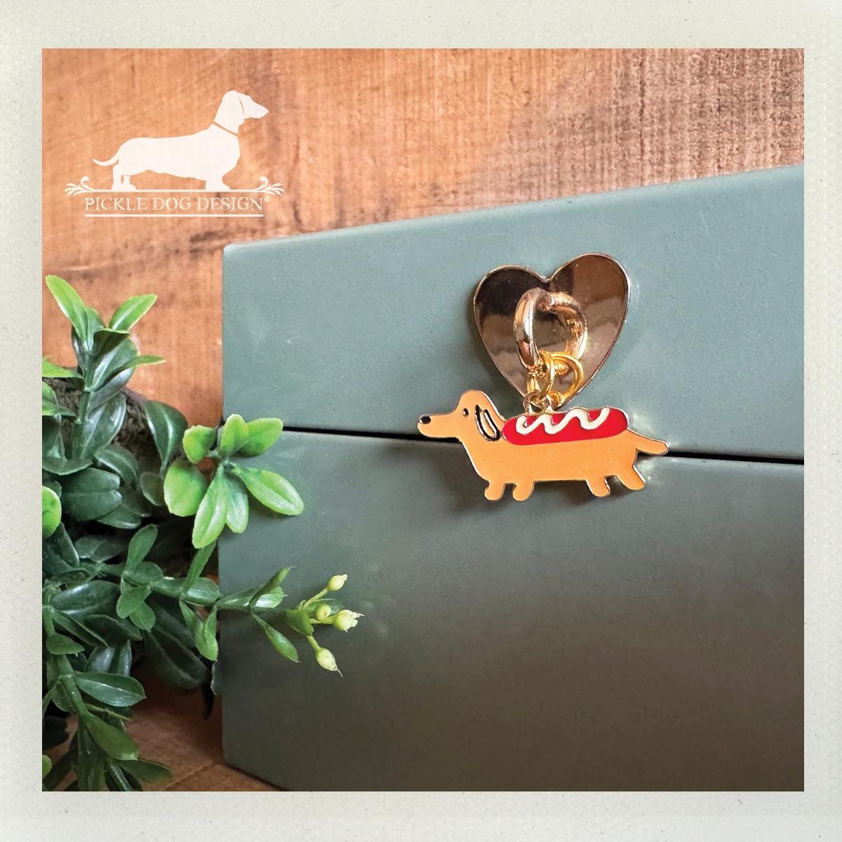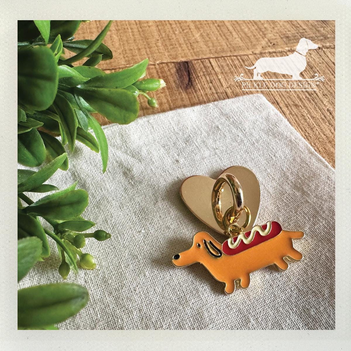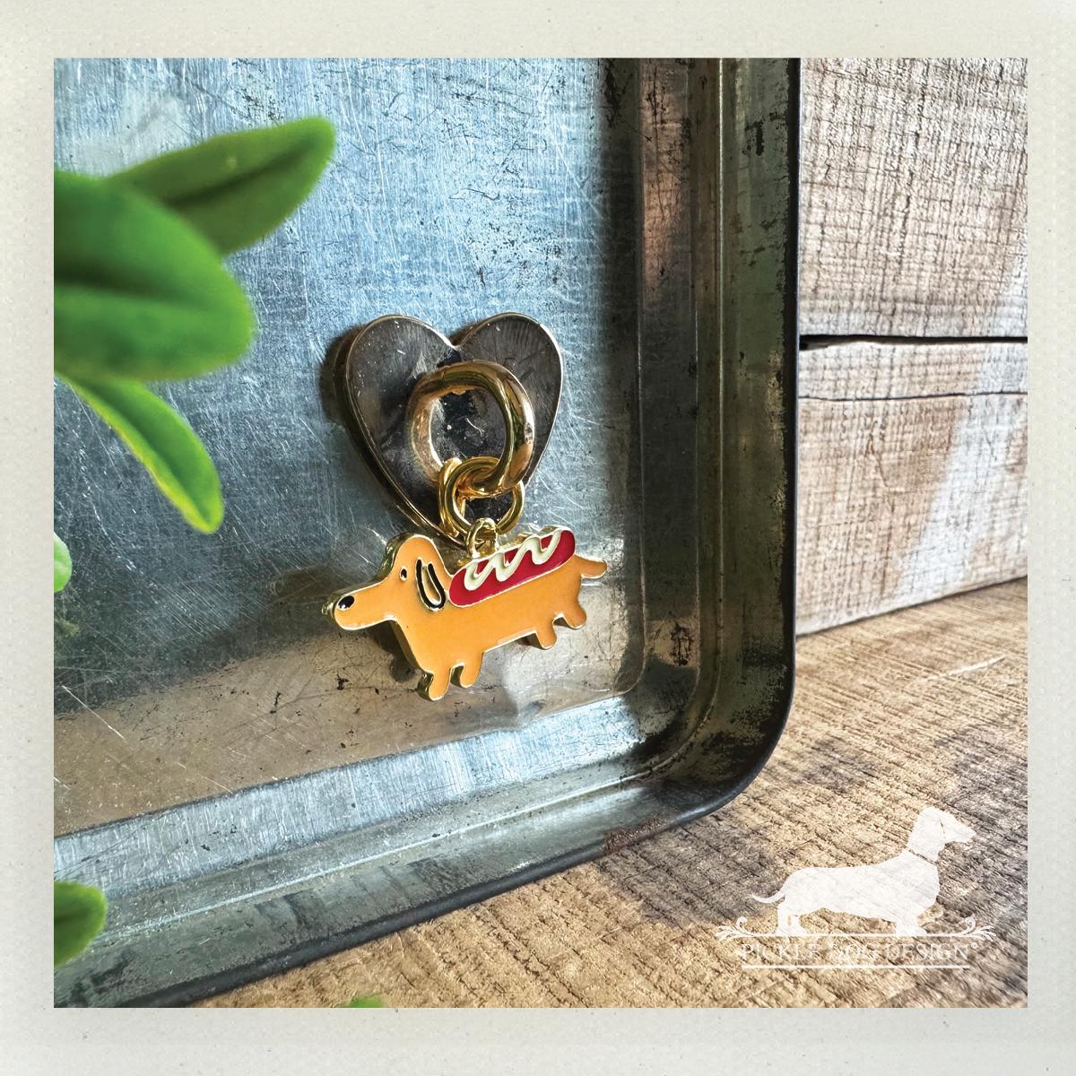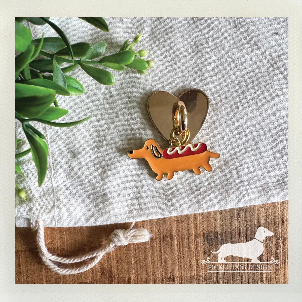 Hot dog doxie charm measures about 1.5" x 0.75" (38mm x 19mm).