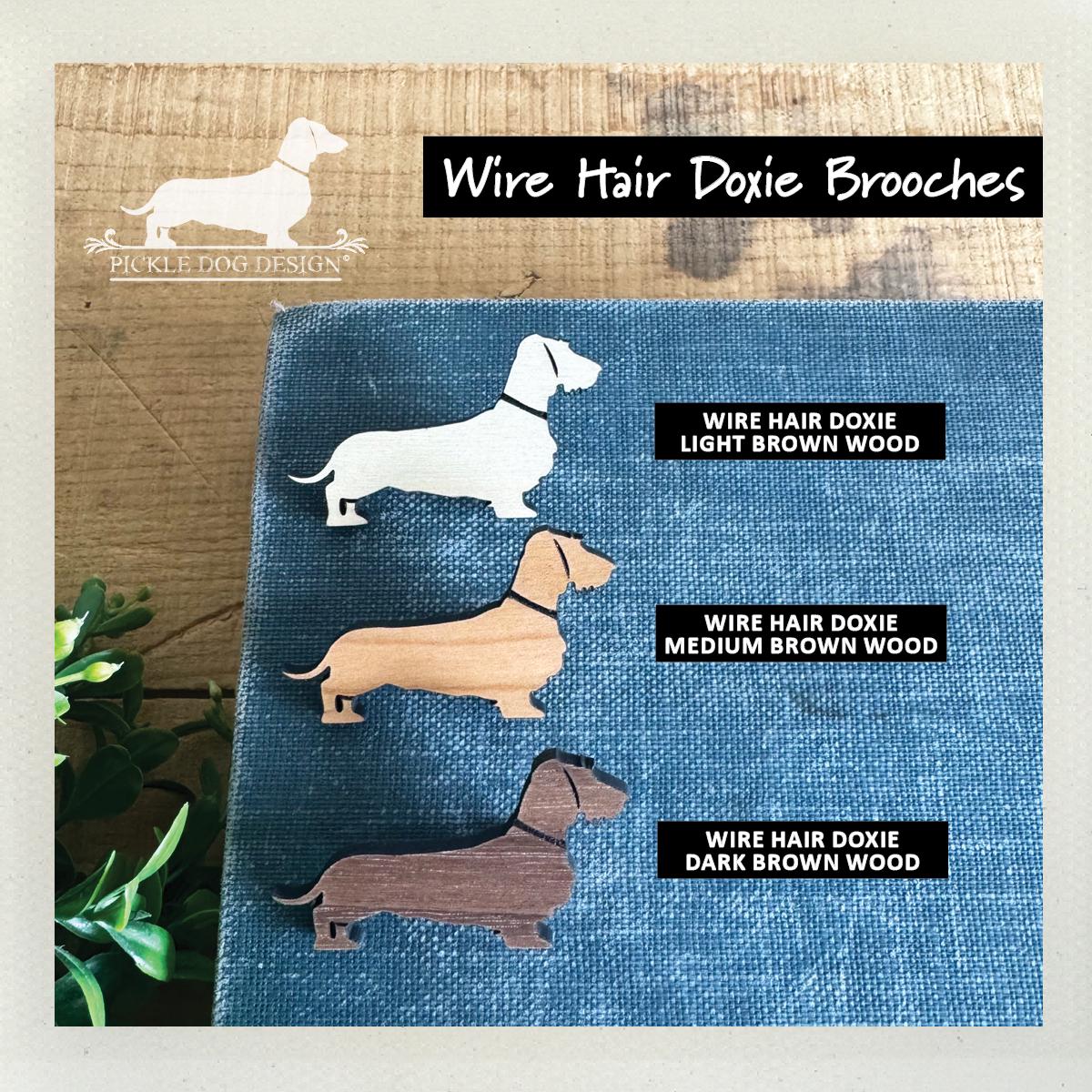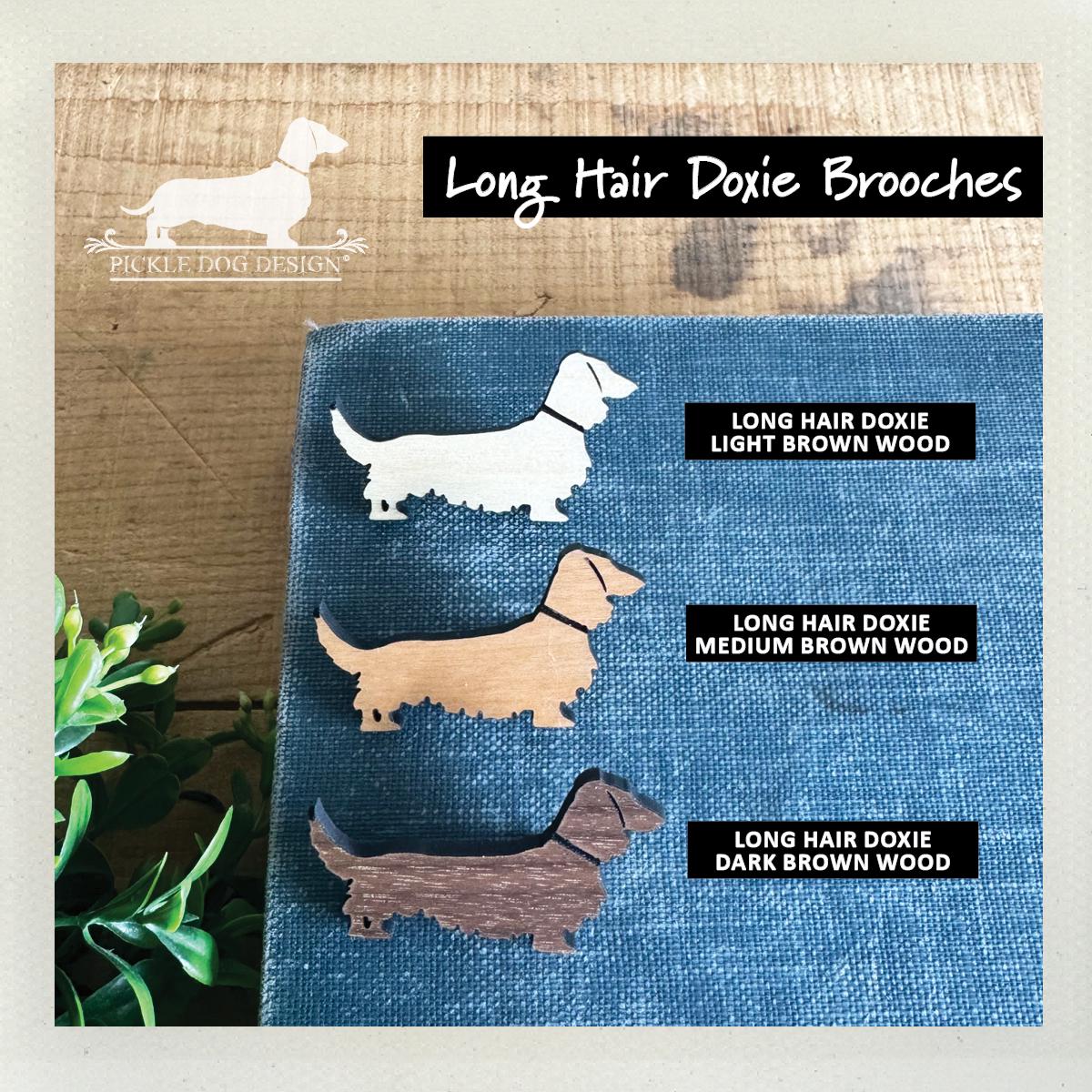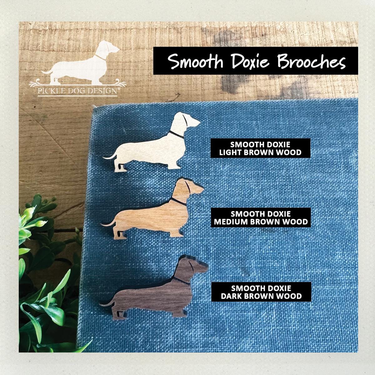 Wood doxie brooches are made from maple, cherry, and walnut wood.