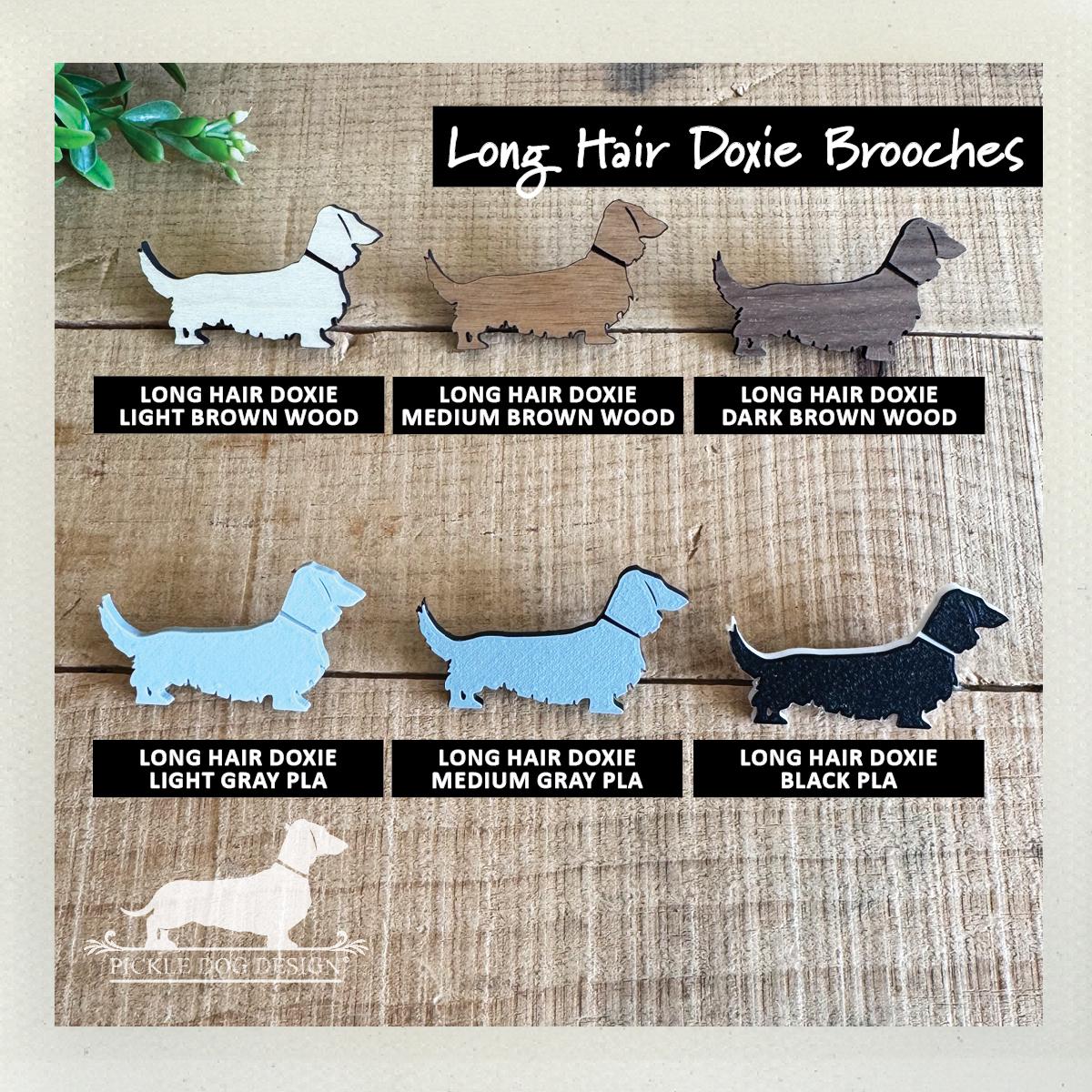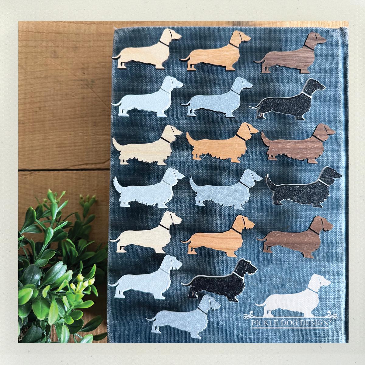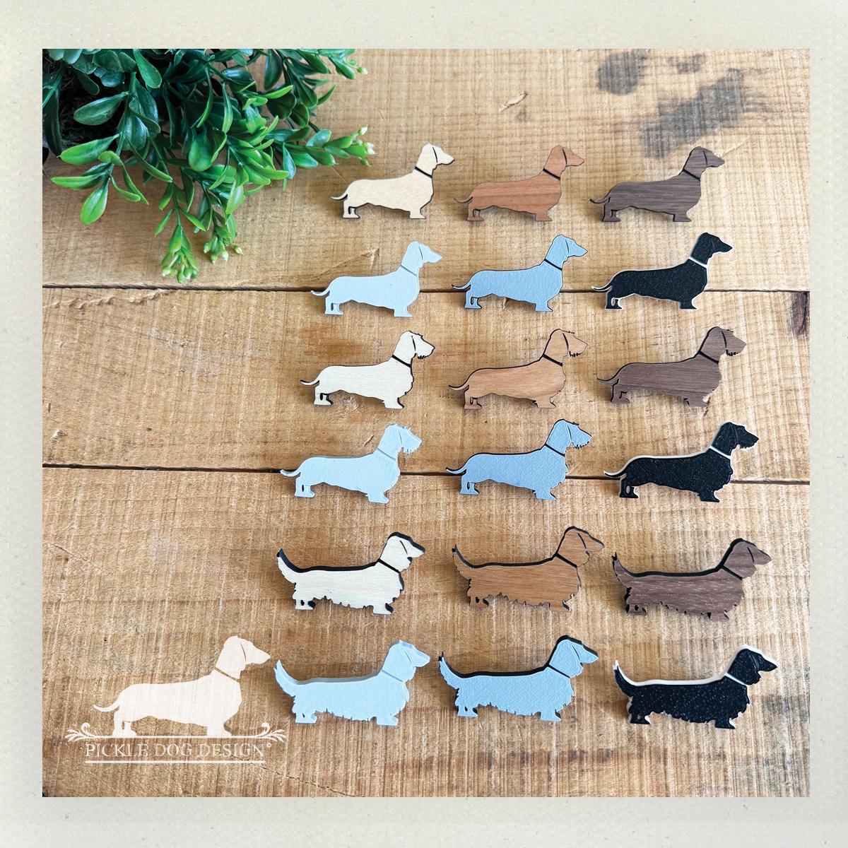 Want to show your love for the doxie? Then wear a little dachshund flair! Featuring our exclusive doxie designs laser cut from maple, cherry, and walnut wood and 3D printed with PLA filament. Makes a perfect gift!