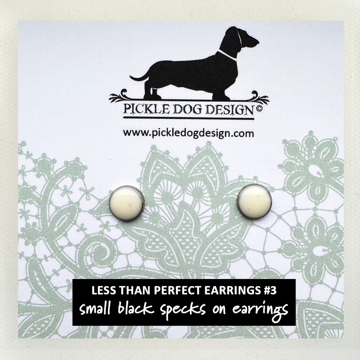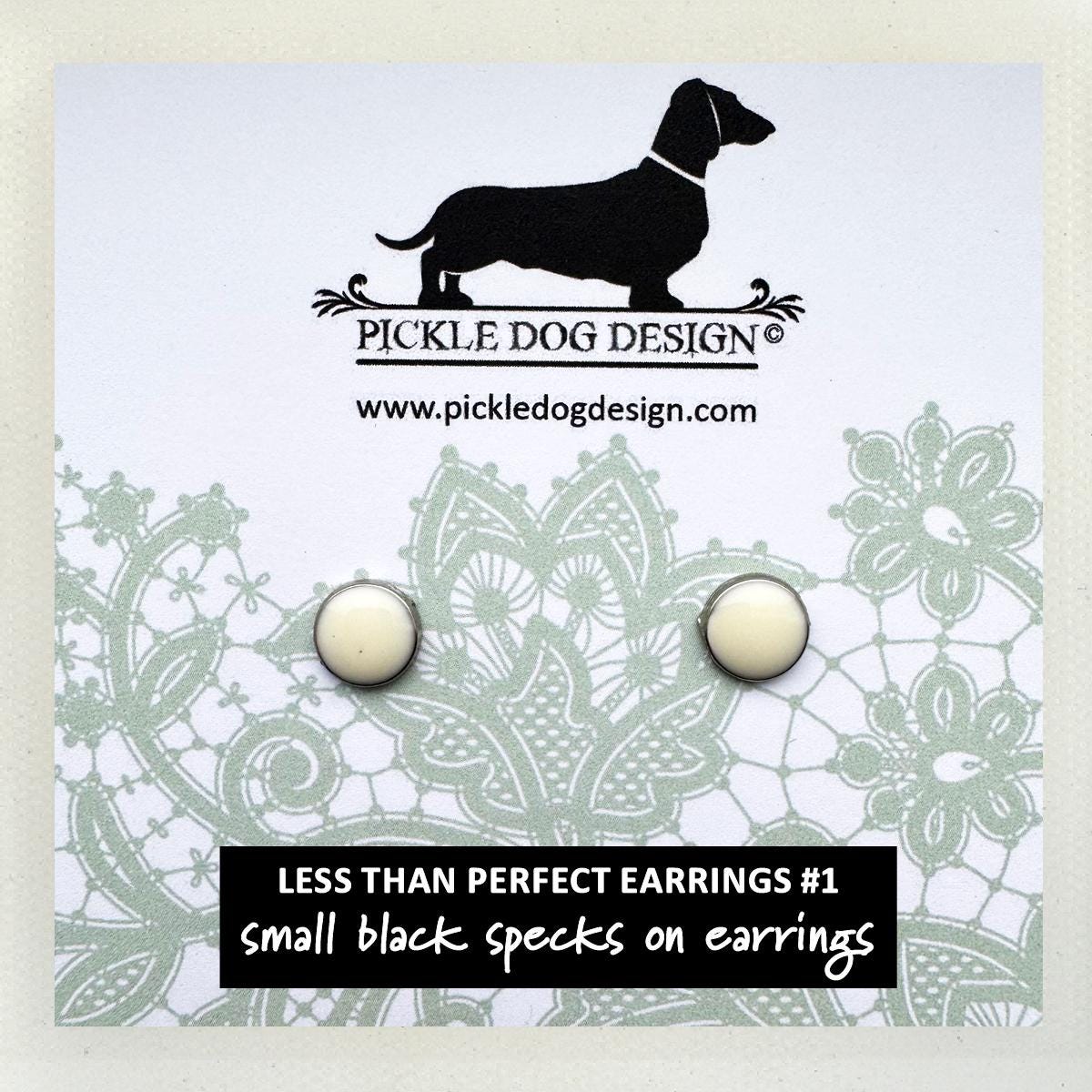 The shade of white may slightly differ per each pair of earrings. If you don't mind slight imperfections, then you found a deal! These earrings each have a slight imperfection of their coloring/marking... and instead of tossing them, we're hoping that at a discounted price they'll find a loving home!